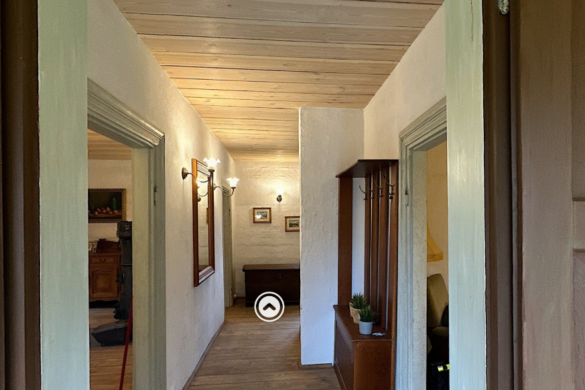 Zaledwie kilka kroków dalej znajduje się przedsionek domu, w którym było miejsce na garderobę Państwa Mackiewiczów i odwiedzających posiadłość licznych gości. Stylowe lustro, komoda, małe obrazy na ścianie subtelnie podkreślają elegancję tego wnętrza.